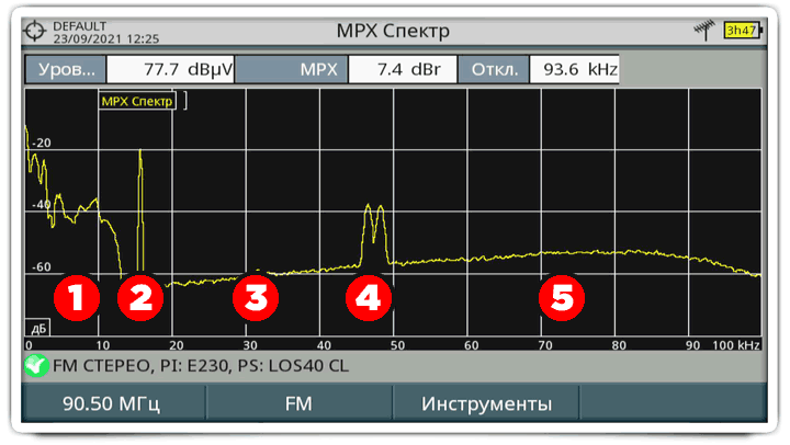 В нижней части экрана отображаются базовые измерения уровня сигнала / несущей и отклонения частоты всех пилот-сигналов, составляющих мультиплексирование FM (MPX).